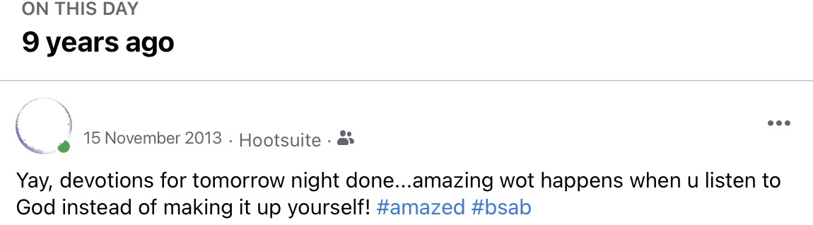 While wandering through my Facebook memories last week, I was reminded that 9 years ago I was getting ready for a weekend away with the band to Guisborough Salvation Army. I had been asked to prepare the pre meeting devotions for the band, and I was struggling to put together something structured and relevant. The memory that really caught my attention that day, was the following memory