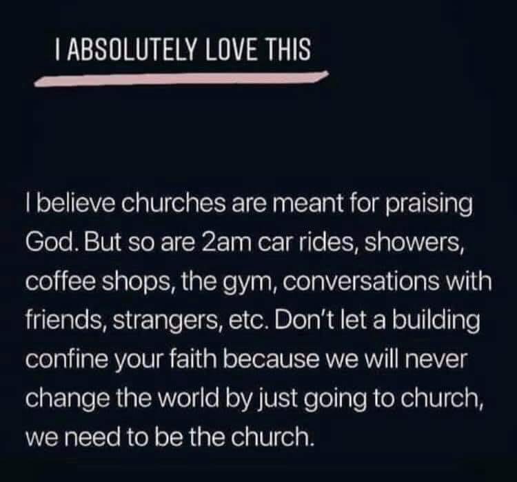 Instead we must live the church in our lives, not just when we’re in church, but also in our every day, daily lives. We must be the church.